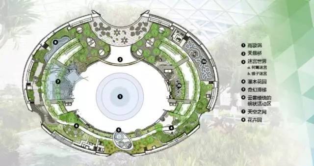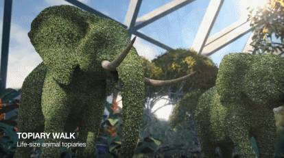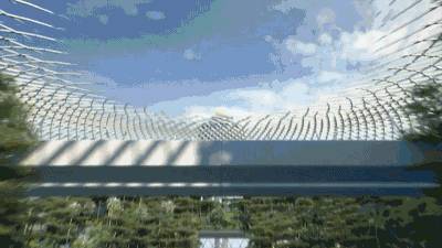 水流从玻璃穹顶中心倾泻而下,是风景也是收集雨水的环保设计,瀑布以每分钟1万加仑的速度循环,同时为边上的景观环境提供冷却和气流。白天这里水声、花香、鸟语汇聚到一起,就像一个热带雨林。