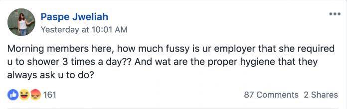 而前些日子,一名女佣就在脸书上倾诉,雇主要求她一天至少冲凉3次。