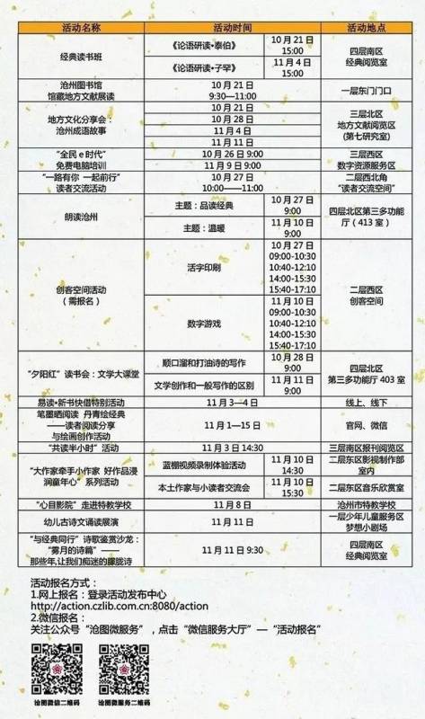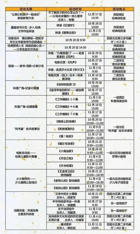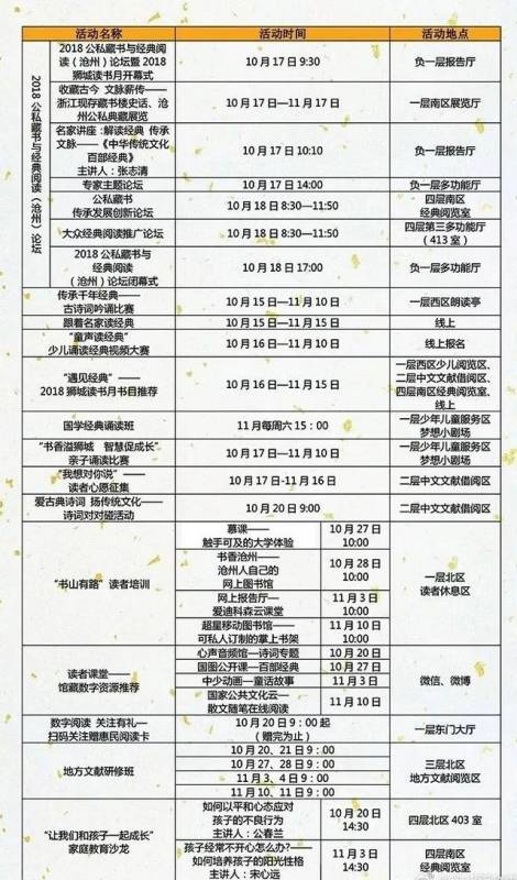 据沧州图书馆相关负责人介绍,读书月活动期间,将陆续推出遇见经典——2018狮城读书月书目推荐(活动期间,每天都有好书推荐)、“共读经典”主题系列讲座(10月21日、27日,11月3日、4日、11日)、视读——读书·观影·分享沙龙(10月20日、27日,11月3日、10日)、“与经典同行”诗歌鉴赏沙龙(11月11日)、“经典伴我”特殊群体阅读(11月8日)等阅读推广活动。届时,读者可根据自己的需求爱好走进图书馆,在丰富多彩的活动中乐享书香与智慧。