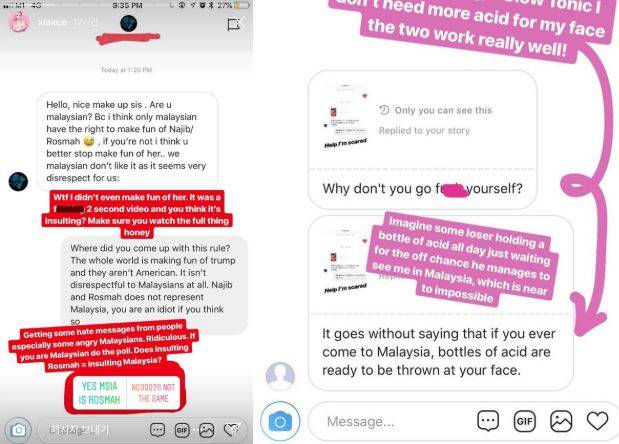 还有更疯狂的网友甚至一直发恐吓和骚扰信息给她,更说如果在马来西亚街头看到她,会用硫酸泼她脸上…….
