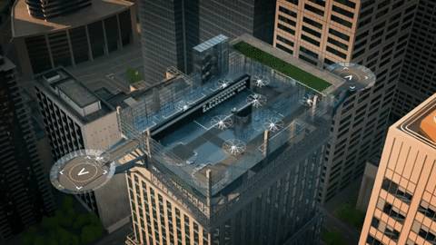 写字楼的顶楼将改造成为“站点”,里面有传送带系统、供德士更换电池组的空间、以及将飞机转移至地下维修厂的巨大电梯等。