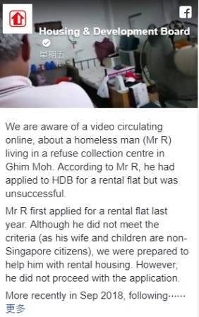 广告建屋发展局前天(19日)晚上通过Facebook发布贴文,针对事件作出回应表示,男子Mr R去年第一次申请租赁单位。“虽然他并不符合申请要求(他的妻子和孩子都不是新加坡公民),我们还是准备好帮助他租房子。然而,他并没有继续申请下去。”