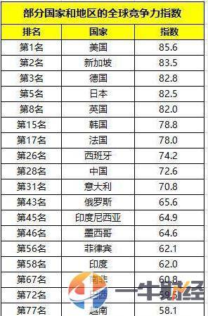 一牛财经注:全球竞争力报告是世界经济论坛从1979年开始就对每个国家的竞争力进行评判,是目前国际上从事竞争力评价最著名的机构之一,它通过对一个国家进行综合因素考评,推出一年一度的《全球竞争力报告》。