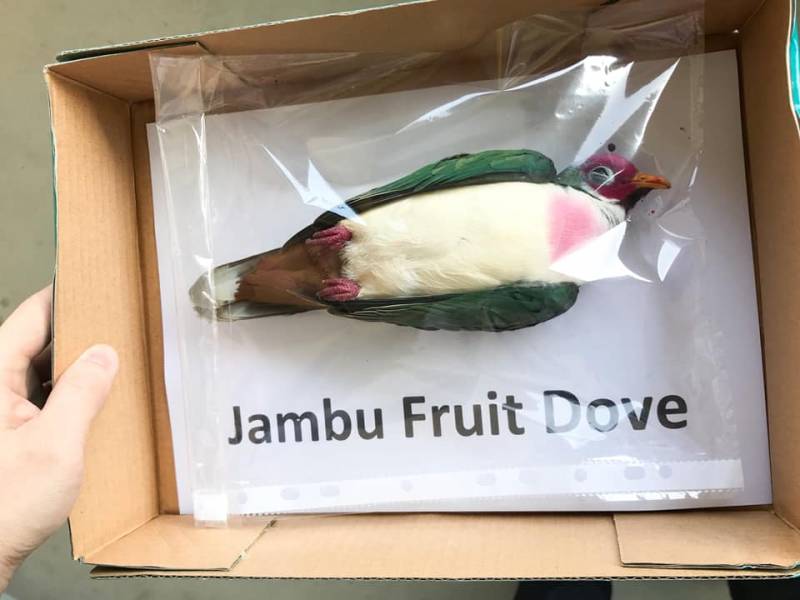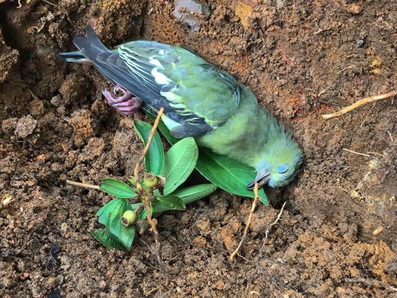 在电脑室外的走廊,发现一只濒危鸟类的雄性粉头果鸠(Jambu Fruit Dove),毫无生气地躺在地上,鸟喙流着血。