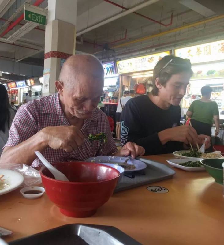 Elliott 当时正在食阁吃着饭,忽然一个老人突然坐在他身边和他聊天。一般人早就态度冷淡的想赶走老人了。可Elliott不仅没有不耐烦赶走老人,还额外点了一份食物给老人。两人还愉快的聊起了天。