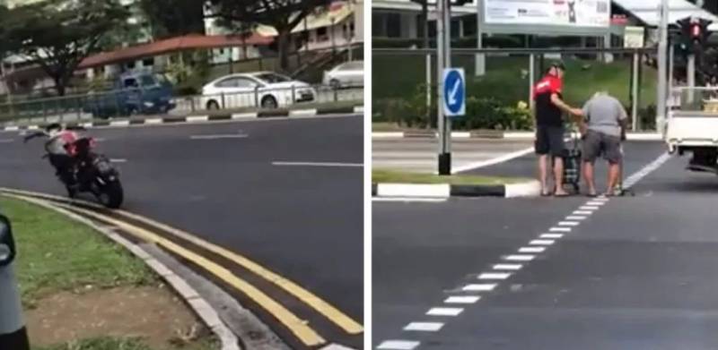 摩托骑手下车帮老人过马路