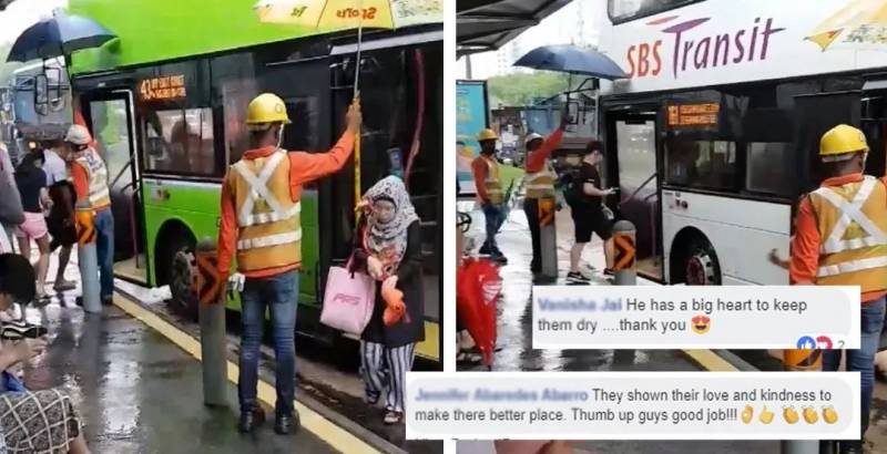 网友Winson在乘公交时就遇到这样的情况。虽然车门到遮雨棚只有几步之遥,但车外的瓢泼大雨,还是让准备下车的Winson感到头疼。可没想到,当他准备硬著头皮冲进雨里。头顶竟然撑起了伞,而为他打伞的,是几位在附近施工的外国劳工。这些劳工正自发的为每一位到站的乘客打伞,而打伞的他们却在淋雨。