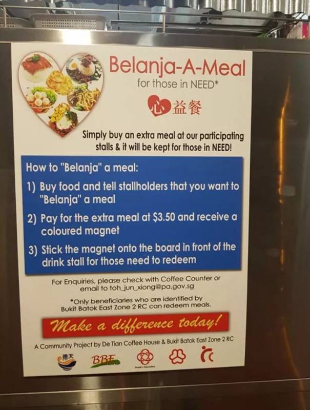 这家店主和附近的摊贩合作,推出一个“Belanja-A-Meal”活动,你可以在这里花最少的钱(3.5新元),然后换得一个磁力贴。你可以将这个磁力贴贴在店家门口。如果有人因为手头拮据,没钱吃饭,就可以用这个磁力贴,免费从店家那里换一份原价7新的食物。