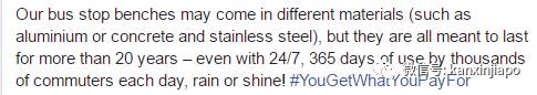 暗戳戳地说了别人的不好,接下来当然就是要夸自己啦:“巴士站板凳需要工作二十年,每年365天,每天24小时,不论阴晴雨雪都要服务上千人”#YouGetWhatYouPayFor(物有所值)