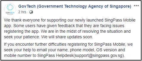 后来,政府科技局也在Facebook上发文说,他们收到很多用户反馈无法登入SingPass手机应用。他们说当局正在努力坚决问题,希望大家见谅。