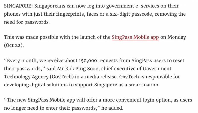 根据新加坡海峡时报,商业时报,8频道新闻等多家媒体报道,新加坡电子政府密码SingPass应用程序正式推出,公众即日起通过指纹和脸部识别就可登录新加坡政府网站进行交易!