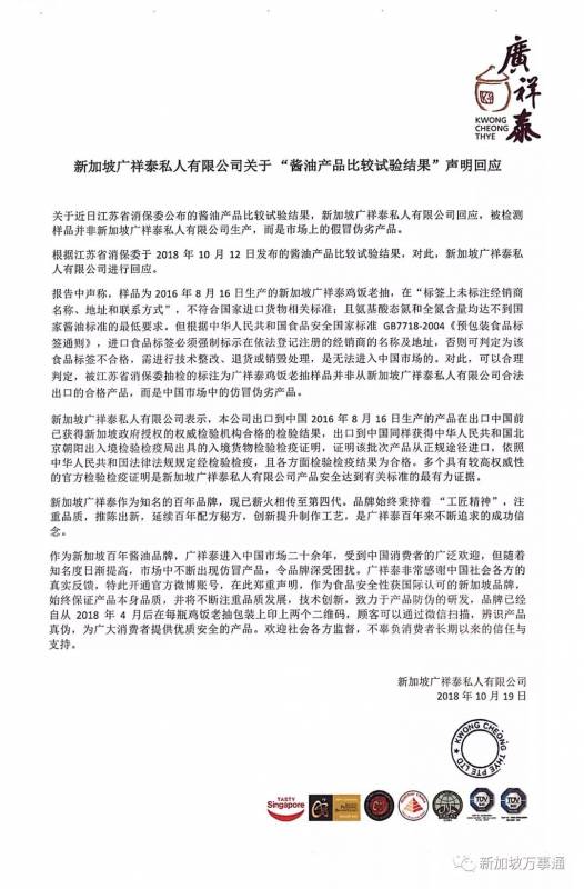 根据江苏省消保委于2018年10月12日发布的酱油产品比较试验结果,对此,新加坡广祥泰私人有限公司进行回应。