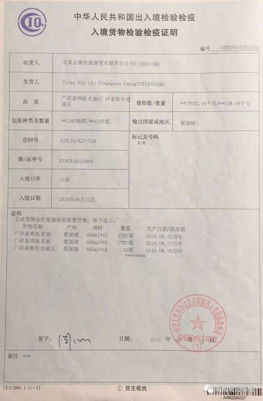 新加坡广祥泰私人有限公司表示,本公司出口到中国2016年8月16日生产的产品在出口中国前已获得新加坡政府授权的权威检验机构合格的检验结果,出口到中国同样获得中华人民共和国北京朝阳出入境检验检疫局出具的入境货物检验检疫证明,证明该批次产品从正规途径进口,依照中华人民共和国法律法规规定经检验检疫,且各方面检验检疫结果为合格。多个具有较高权威性的官方检验检疫证明是新加坡广祥泰私人有限公司产品安全达到有关标准的最有力证据。