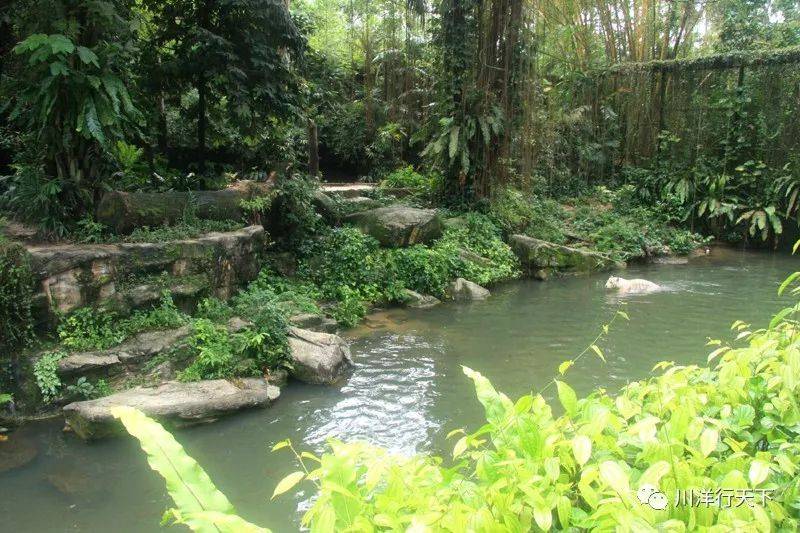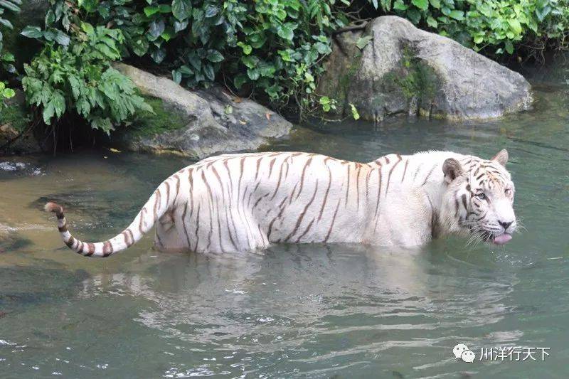 新加坡动物园中有两只白色的老虎,这里没有正常颜色的老虎,只有夜间野生动物园中才有黄色的虎。我还是更喜欢黄色的虎,白虎总是感觉怪怪的。这两只白虎围着场地转悠了一会儿,就都舒服地在水里泡著了,看得我非常羡慕。新加坡的天气太闷热了,我要是这时也能像老虎一样泡在水里乘凉那该多好啊!