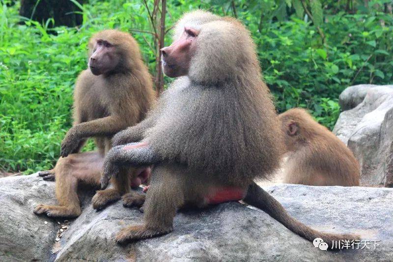 阿拉伯狒(fèi)狒:雌性(左一、左三)和雄性(右二)