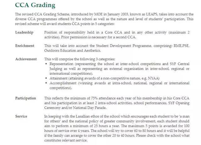 在CCA得分较高的学生可以享受“升学优待”,拿到CCA分数比较容易,只要保证按时出席社团活动、参加一些表演或比赛,就可以拿到不错的成绩。但真的想获得更好的发展,在CCA上也要同样下功夫才行。很多欧美大学很看重学生在CCA团队中的含金量,比如说,俱乐部领袖和普通成员,CCA每周付出的时间,以及获得的奖项,“高分低能”在新加坡行不通。