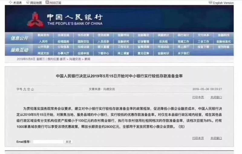 中国央行5月6日早上罕见在市场交易时间段宣布定向降准,决定从5月15日开始,对聚焦当地、服务县域的中小银行,实行较低的优惠存款准备金率,约有1000家县域农商行可以享受该项优惠政策,释放长期资金约2800亿元,全部用于发放民营和小微企业贷款。