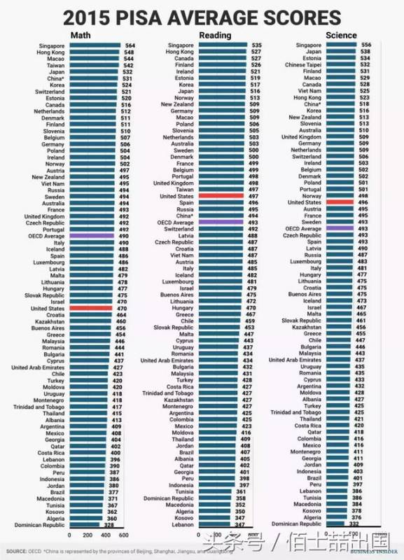 上图:2015年PISA测试(数学,阅读,科学排名)新加坡均位于第一