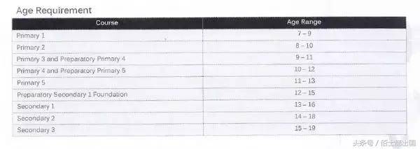 CourseAge RangePrimary 1(小学1年级)7 – 9Primary 2(小学2年级)8 – 10Primary 3(小学3年级)9 – 11Primary 4(小学4年级)10 – 12Primary 5(小学5年级)11 – 13Preparatory Secondary 1 Foundation (PS1F)(初中1年级预备课程)12 – 15Secondary 1(初中1年级)13 – 16Secondary 2(初中2年级)14 – 18Secondary 3(初中3年级)15 – 19