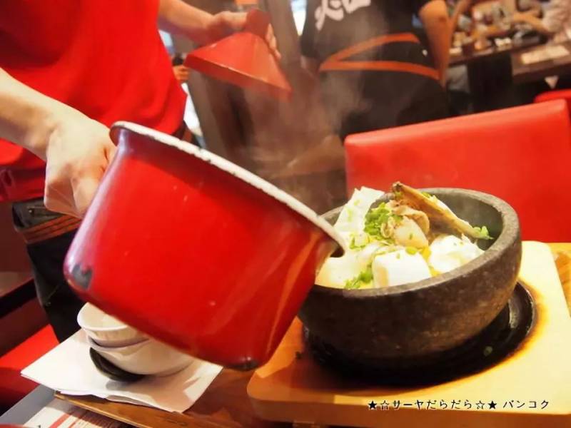 每碗拉面在端上桌的时候只有面条和配菜并没有汤底,之后服务生会将浓稠的汤底倒入碗中,然后为石碗盖上“小红帽”,热气从“帽子”顶端冒出,饶有趣味。等沸滚一段时间拿下“帽子”,将剩余的汤料全部倒入石碗才算大功告成。