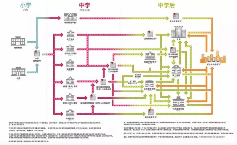 新加坡多元化的升学路径。新加坡的中学提供三项不同源流的课程,根据学生的小学离校考试 (PSLE) 成绩,孩子将被分配到三类学校:快捷(包括一些学校所提供的综合课程)、普通(学术)或普通(工艺)课程。