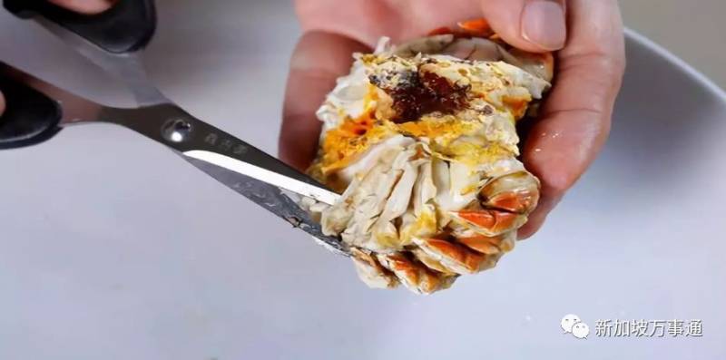 第一步:把大闸蟹的腿和钳子用剪刀剪下来~把大闸蟹的肚子底下扯出来,因为这是大闸蟹的肠所在,蟹肠极寒,所以不宜食用!