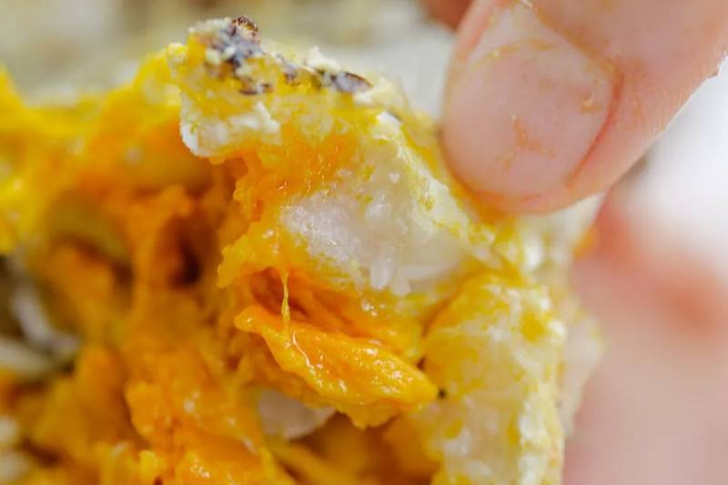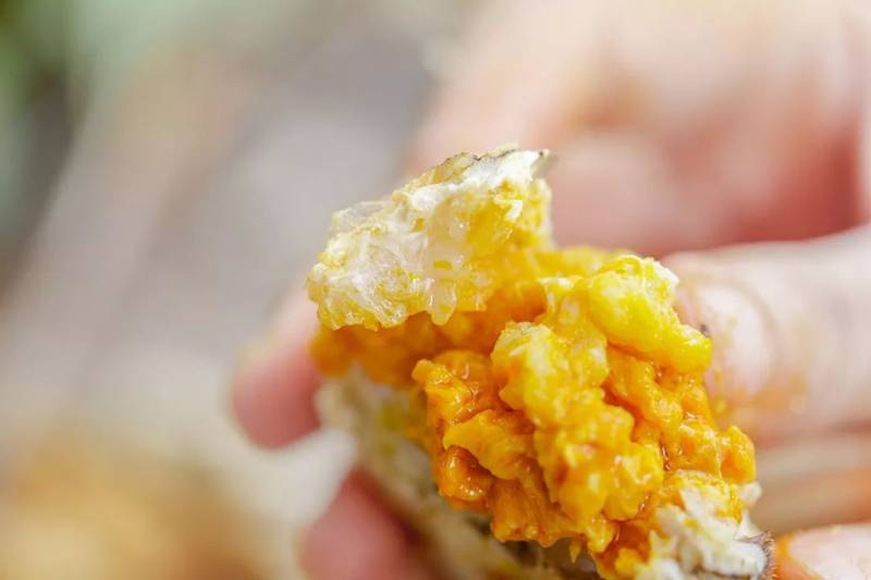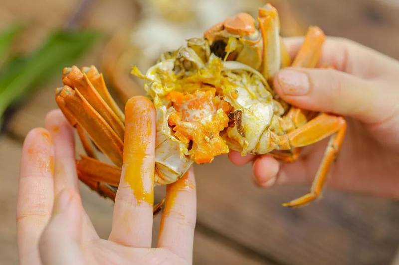 第六步:关键时刻来啦~掰开螃蟹,露出的就是鲜嫩的蟹黄或蟹膏和蟹肉了。
