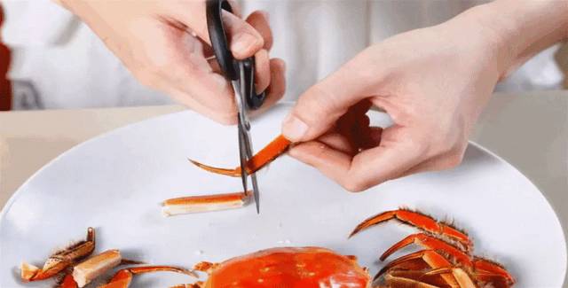 第七步:吃完主体就到蟹腿、蟹钳啦!剪下来的蟹腿尖可以用作工具,用尖腿可以把蟹腿中间的肉推出来,蟹钳可以变成勺子用来挖蟹肉。剪刀从蟹钳中间轻轻剪下去,就能分开,取出里面鲜嫩的蟹肉!