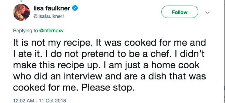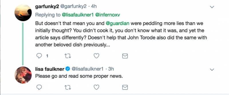更是有网友回复Faulkner说,这不就代表她与杂志Guardian编制了更多谎言,因为杂志上明明说是她下厨的。