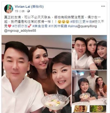 (新加坡24日讯)自Pokka事件后,神隐多时的赖怡伶,昨日和权怡凤先后在各自面子书贴文,两人与著名美发师李荣达尝美食、聊天,通宵达旦,显见友谊深厚。