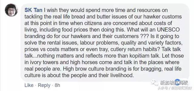 小贩中心内部那些最迫切的民生问题——持续高涨的租金(转化为食物价格的飙升)、贵得离谱的各类杂费(包括托盘费)、社会企业经营不当,鸟类四处觅食不卫生、厕所脏乱、美食传承青黄不接等等,依然未得到妥善处理,政府现在又是砸钱又是投入人力资源成立提名委员会,来开展小贩文化申遗这种“风雅逸事”,难免会让人产生本末倒置的印象,网上自然是怨声四起。