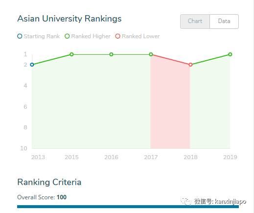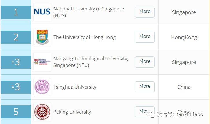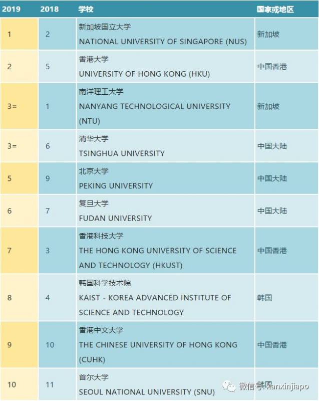 除了NUS回归第一,去年排第五的香港大学回归第二。而去年第一的NTU则和清华大学并列第三。