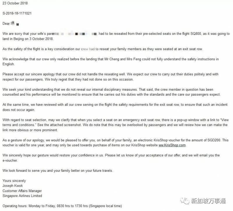但是邮件内容有些敷衍,还有就是他们强调我父母的付费座位是安全出口,是安全条例要求不懂英语不能坐,但我的父母在PEK-SIN北京到新加坡(付费选择)和MLE-SIN马尔代夫到新加坡(值机时选择)也都是坐在安全出口座位,空乘也都没有异议!所以她们其实是前后矛盾的!