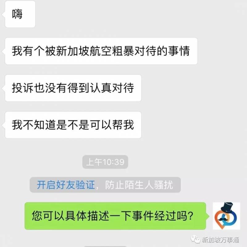 但是就在今天,万事通居然收到一位通心粉发来的信息,表示自己的父母在乘坐新航航班时被粗暴对待!新航可是世界第一的航空公司,很多乘客选择新航就是看中了他们的服务,居然会发生这种事!