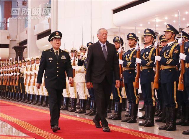 10月24日上午,国务委员兼国防部长魏凤和在八一大楼与来华出席第八届北京香山论坛并正式访问的新加坡国防部长黄永宏举行会谈。会谈前,魏凤和为黄永宏举行欢迎仪式,并陪同检阅中国人民解放军三军仪仗队。李晓伟摄