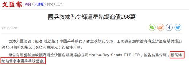 孔令辉被香港《文汇报》爆料他在2015年2月在新加坡赌场欠钱不还,并在香港受审,但并没有透露为何孔令辉一个大陆人,在新加坡欠钱不还,要去香港受审的原因,而只是突然爆料。