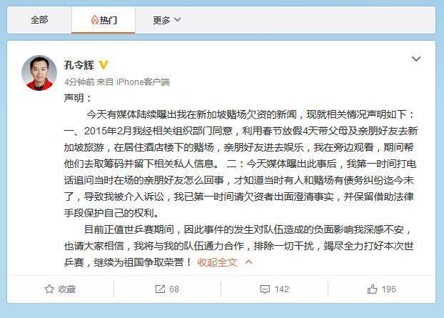 第一就在事情报道后,孔令辉直接发表了声明表示,他是替朋友弄得,他自己并不知情,而在香港报纸报道的孔令辉就算真的参赌,他也不会傻得把地址留成中国桌球协会,他是拿自己的仕途开玩笑嘛?