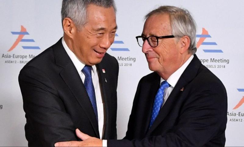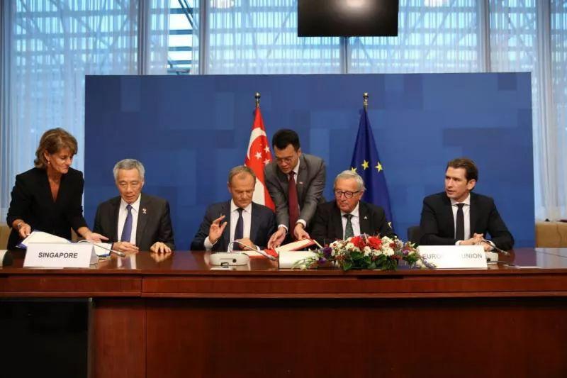 新加坡总理李显龙于奥地利时间10月19日下午在第12届亚欧会议闭幕后,与欧洲理事会主席图斯克(Donald Tusk)、担任欧盟轮值主席的奥地利总理库尔茨(Sebastian Kurz)和欧盟委员会主席容克(Jean-Claude Juncker),签署欧盟—新加坡自贸协定(EUSFTA)。