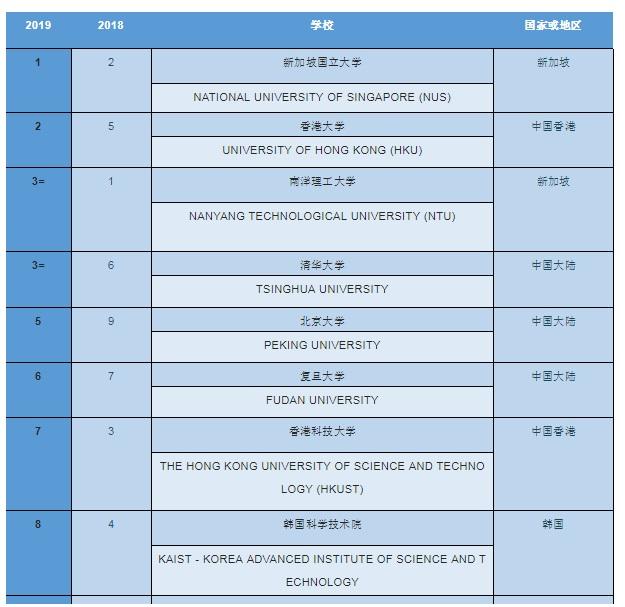 相较去年,今年的榜单发生较大变化,新加坡国立大学上升一位重新回归第一!南洋理工大学和清华大学并列第三!