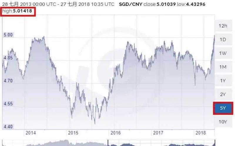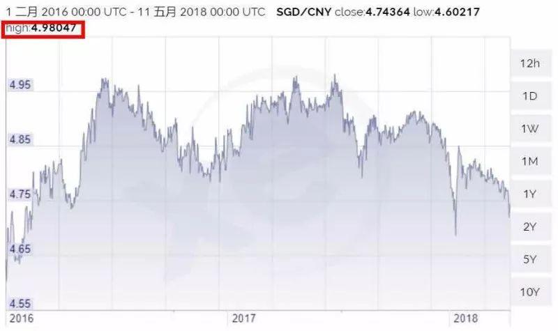 要知道,在过去的2016年、2017以及2018年上半年这两年半的时间里,新币兑人民币的汇率从来没破5,最高也就是4.98。