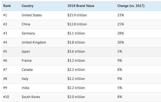 具体而言,2018年全球国家品牌价值最高的美国已经接近26万亿美元,是排名第二的中国的12.8万亿美元的两倍。而中国又是接下来的德国的5.1万亿美元国家品牌价值的两倍还多。