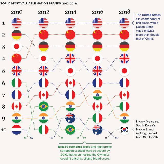 从2010年以来的国家品牌排名变化来看,美国一直稳居第一,而中国自从2012年拿下第二的宝座也是稳居第二,德国在第三的位置上也是纹丝不动。后续的位置变动稍微大一些,但是整体来看也是我们熟悉的经济体量较大的经济体。