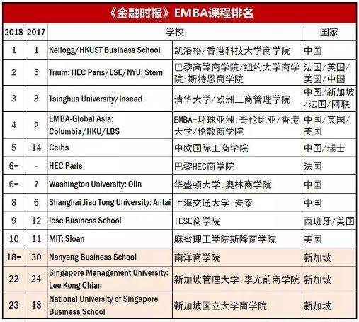 最新的《金融时报》EMBA课程排行榜前三名变化不大,香港科技大学与美国西北大学凯洛格管理学院(Kellogg School)联办课程,以及清华大学与欧洲工商管理学院(INSEAD)联办课程分别蝉联第一和第三名的位置。
