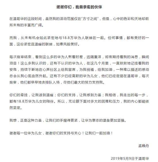 你们的牵挂,让我读到温暖;你们的支持,让我感到力量;我相信,我走出的每一步,都有18.8万华为儿女的陪伴。所以,无论眼下面对多大的困难和压力,我的内心都能依然坚定。