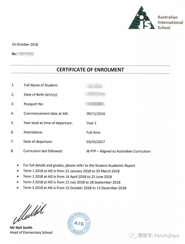 (新加坡澳大利亚国际学校确认小孩上过学,没有交学费)