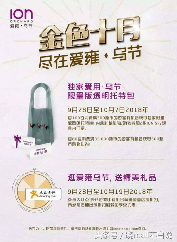 今天12:30的时候,爱雍乌节(ION)的微信公众号发了庆国庆的文章《狮城还能这样玩?这里有大招!》,除了介绍美食(南洋风味)、想不到还有针对国庆游客的SP!500新币可获得限量版透明托特包,我刚刚查了下,500新币是2300元左右,那这个满额赠还是蛮值的嘛,除了托特包,还有2张IONsky观景台门票(每张价值$20)、购物券、礼物,真的很用心很会打包了!
