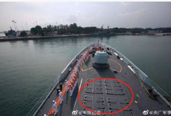 红圈中的是中国国产第一种通用的垂直发射装置,也是第一款获准出口的中国产垂发装置,通常装备在054A级护卫舰上,图源:央广军事