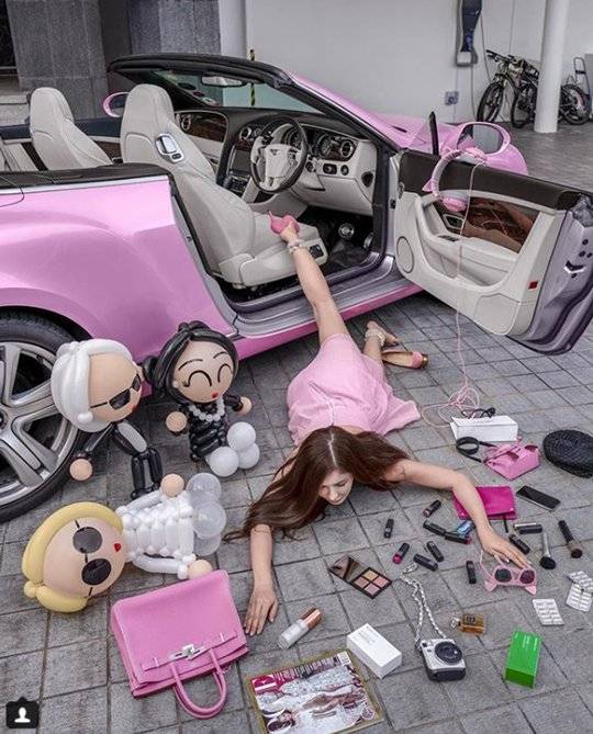 (新加坡26日讯)“炫富摔”风潮吹到狮城,本地名媛蔡欣颖跟着效仿,从全球限量版粉色宾利一摔,“摔”出价值2万元(6万令吉)爱马仕柏金包和名牌高跟鞋。