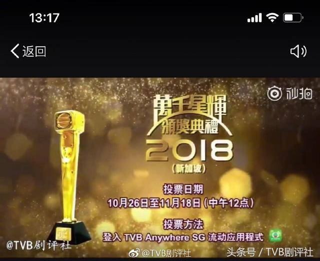 TVB今年取消新加坡、大马两地颁奖礼,改在11月19日《#万千星辉贺台庆#》当晚公布两地的视帝视后,而最佳剧集奖就将于12月16日举行#万千星辉颁奖典礼2018#(TVB台庆颁奖礼)上宣布。