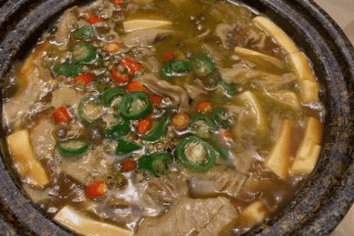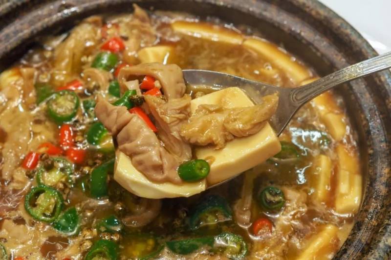 石锅豆花肥肠,简直就是为了秋冬而存在的美味佳肴。肥肠和豆花在石锅中不停的翻滚,闻到的是一阵阵藤椒的气息。